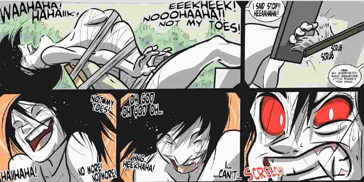 In the comic strip “Make the goth girl lagh,” by Pawfeather the protagonist must avoid laughing in order to activate a transformation. Of course, she ends up prey to zealous beauticians who do not fail to vigorously brush her feet. Despite all if pleas, she is eventually forced to laugh at the tremendous tickling.